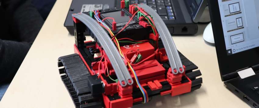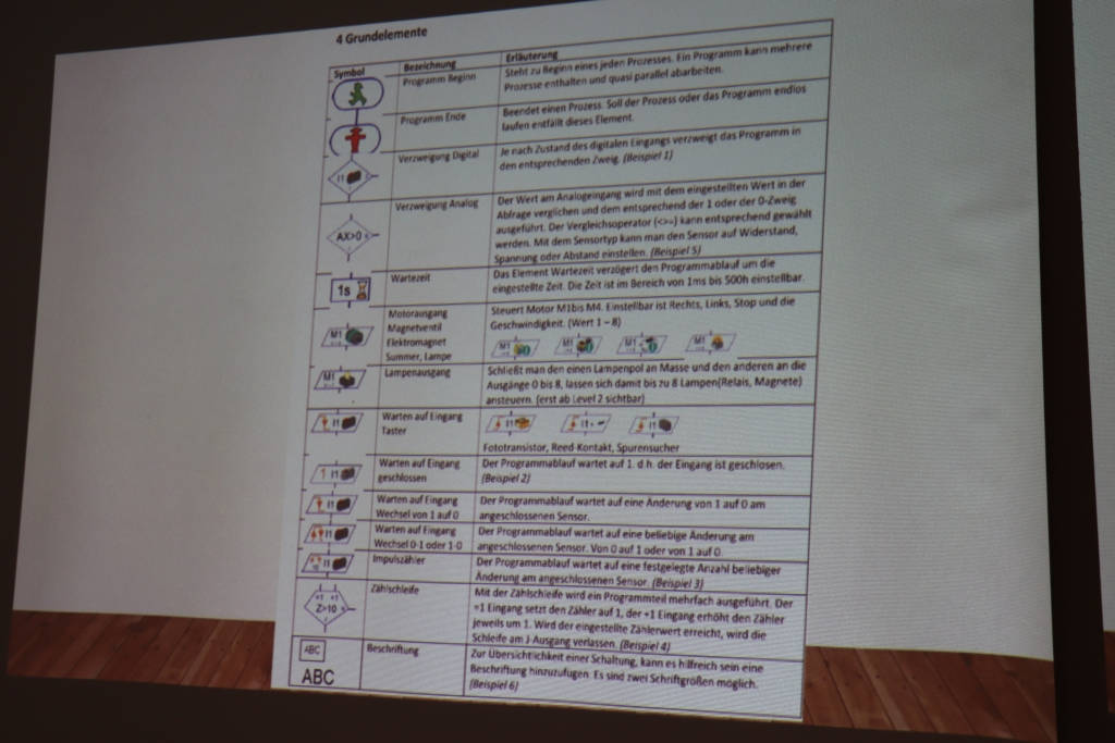 Zuerst präsentierte der Referent den Kursteilnehmern die Grundlagen der Programmierung von Fischertechnikrobotern und zeigte ihnen den Roboter selbst, den er in seiner Freizeit gebaut hatte. Das Prinzip ist ähnlich wie bei Lego Mindstorms, nur das die Fischertechnik Programmierung noch etwas komplizierter ist, aber auch mehr Möglichkeiten bietet.