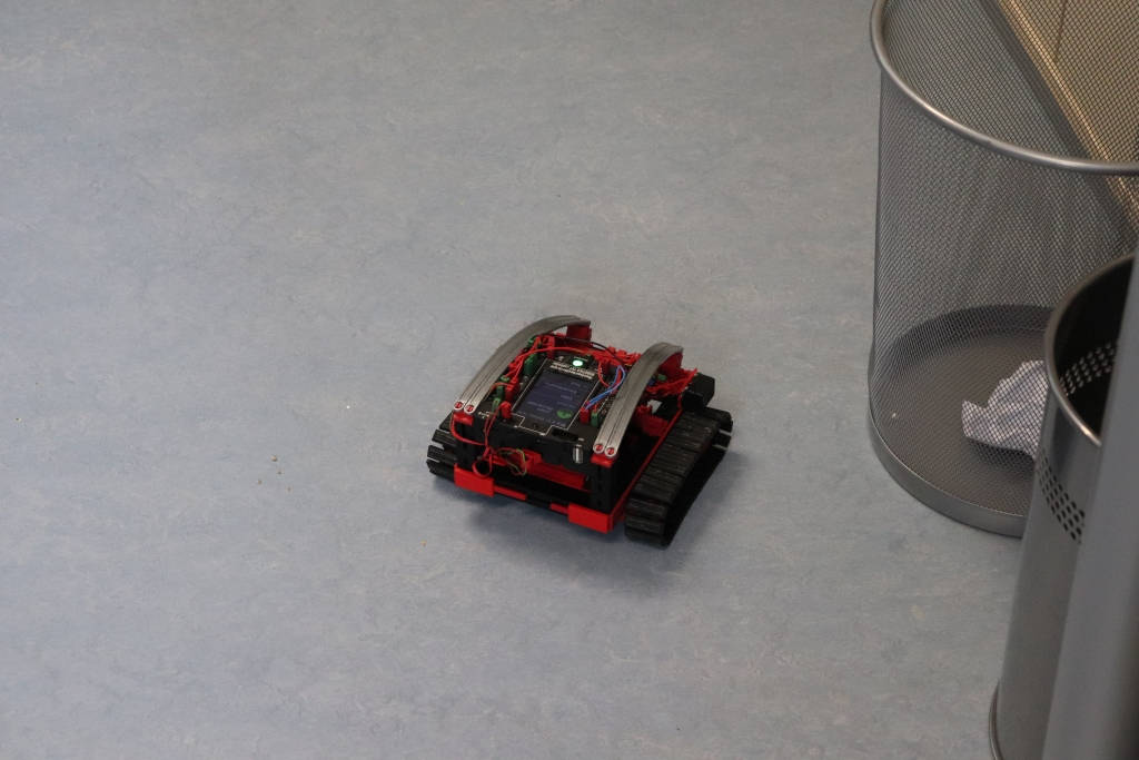 Gleich darauf erklärte er den Jugendlichen das Tagesziel. Der Roboter sollte eine Linie finden, ihr folgen und dabei bestimmte Aktivitäten ausführen. Zu Beginn starteten sie allerdings mit einfacheren Programmierungen, die aufbauend immer schwieriger wurden. So lernten sie Stück für Stück immer mehr Elemente des Programmierens kennen bis sie schließlich bereit waren die Tagesaufgabe zu meistern.