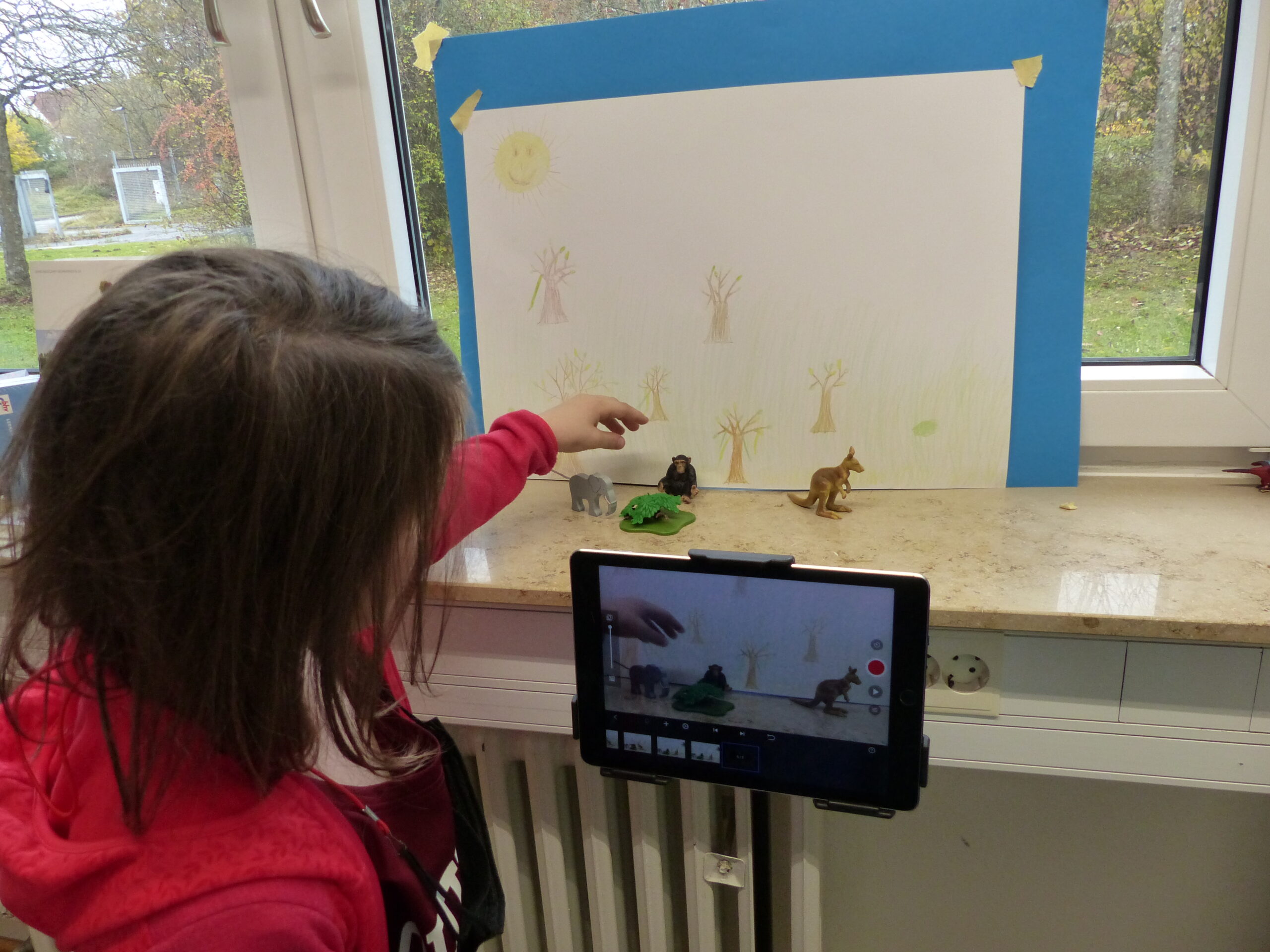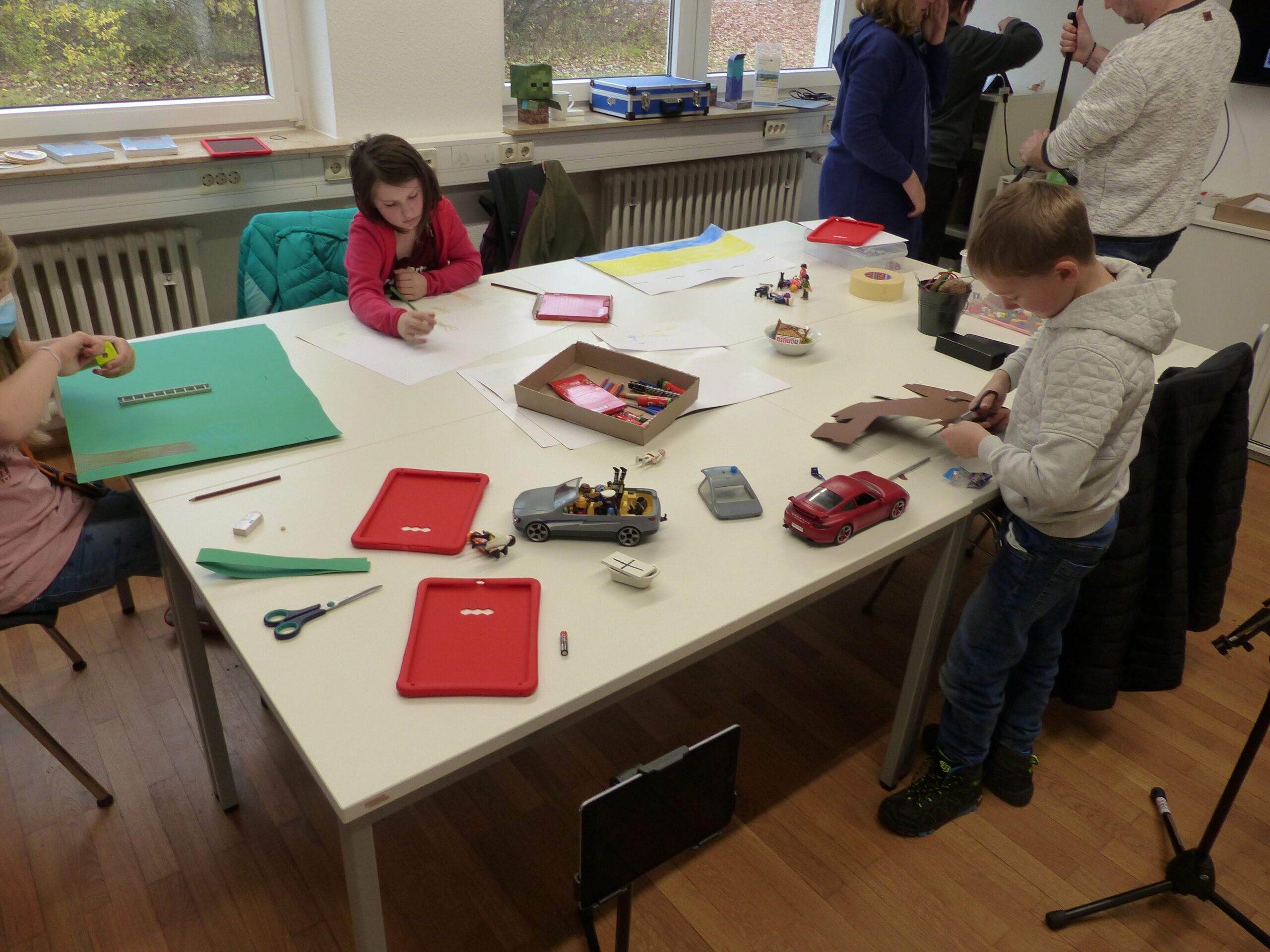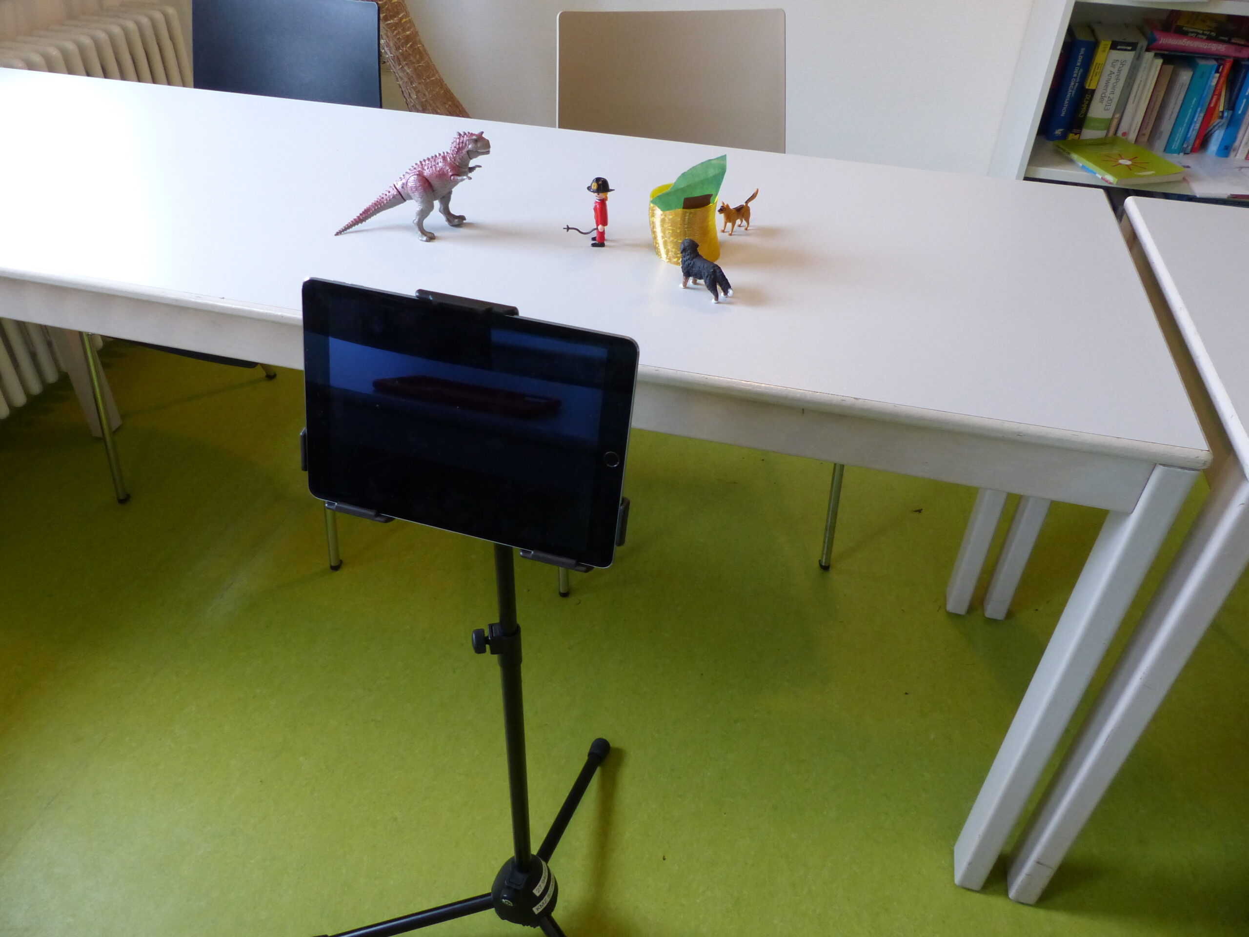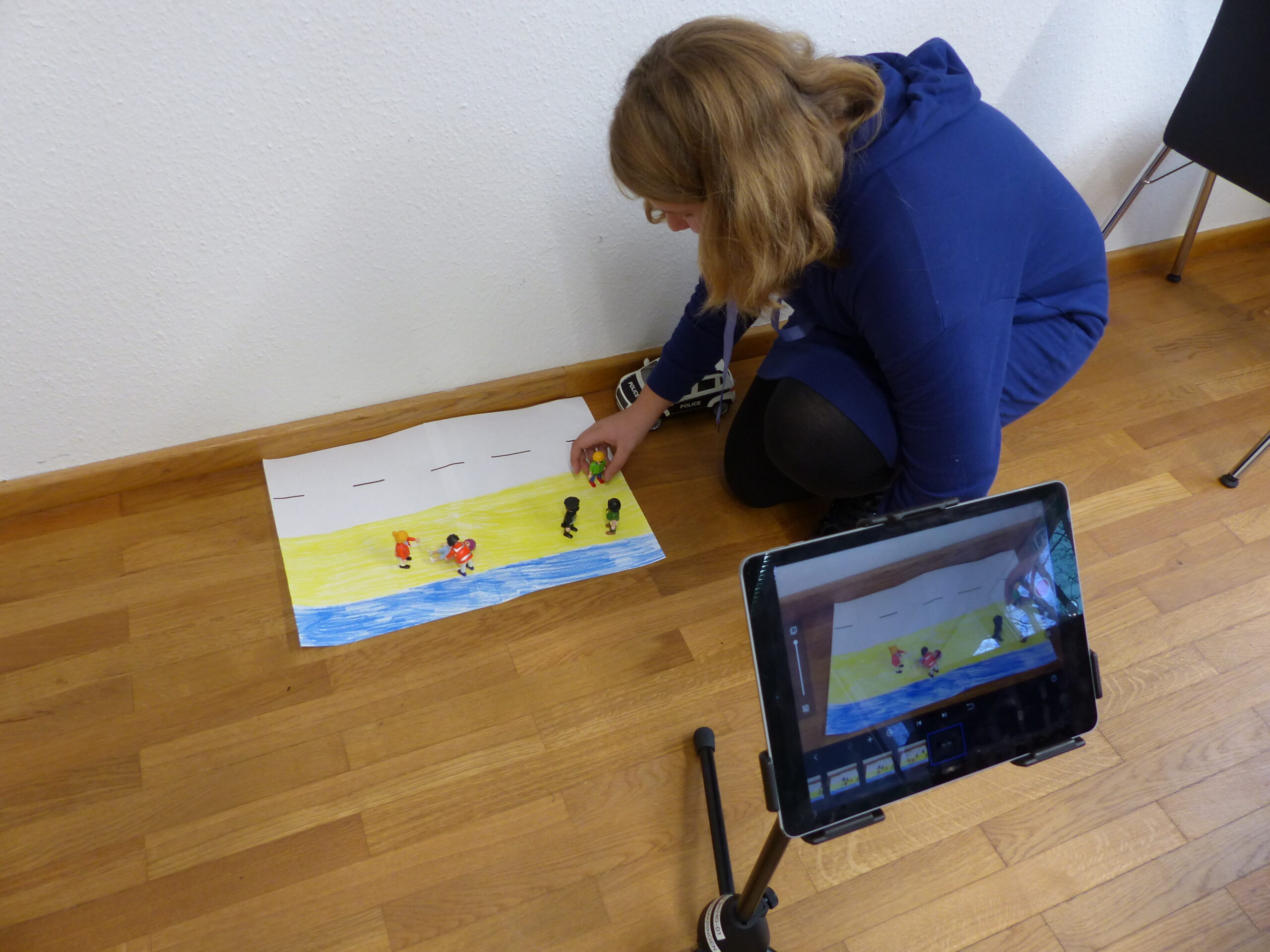 Und genau das taten die Kursteilnehmer auch. Nachdem sie sich kleine Geschichten überlegt und passende Figuren und Requisiten gebastelt hatten und mit diesen ihr Set gestalteten, schnappten sie sich die iPads, welche die kostenlose und einfach zu bedienende App „StopMotion Studio“ installiert hatten, und begannen, die einzelnen Bilder ihrer Szene zu schießen. Zwischen diesen Bildern veränderten sie die Szene jedes mal ein bisschen. Sie bewegten eine Figur hier, drehten eine Requisite da oder fügten neue Elemente hinzu. Die App fügte diesen vielen Bilder, oftmals mehrere hunderte von ihnen dann am Ende zusammen. Zusammen mit einer eigenen Vertonung des Films von den Teilnehmern entstanden an diesem Tag dann ein paar richtige, hochqualitative Filme, die sich echt sehen lassen können.
